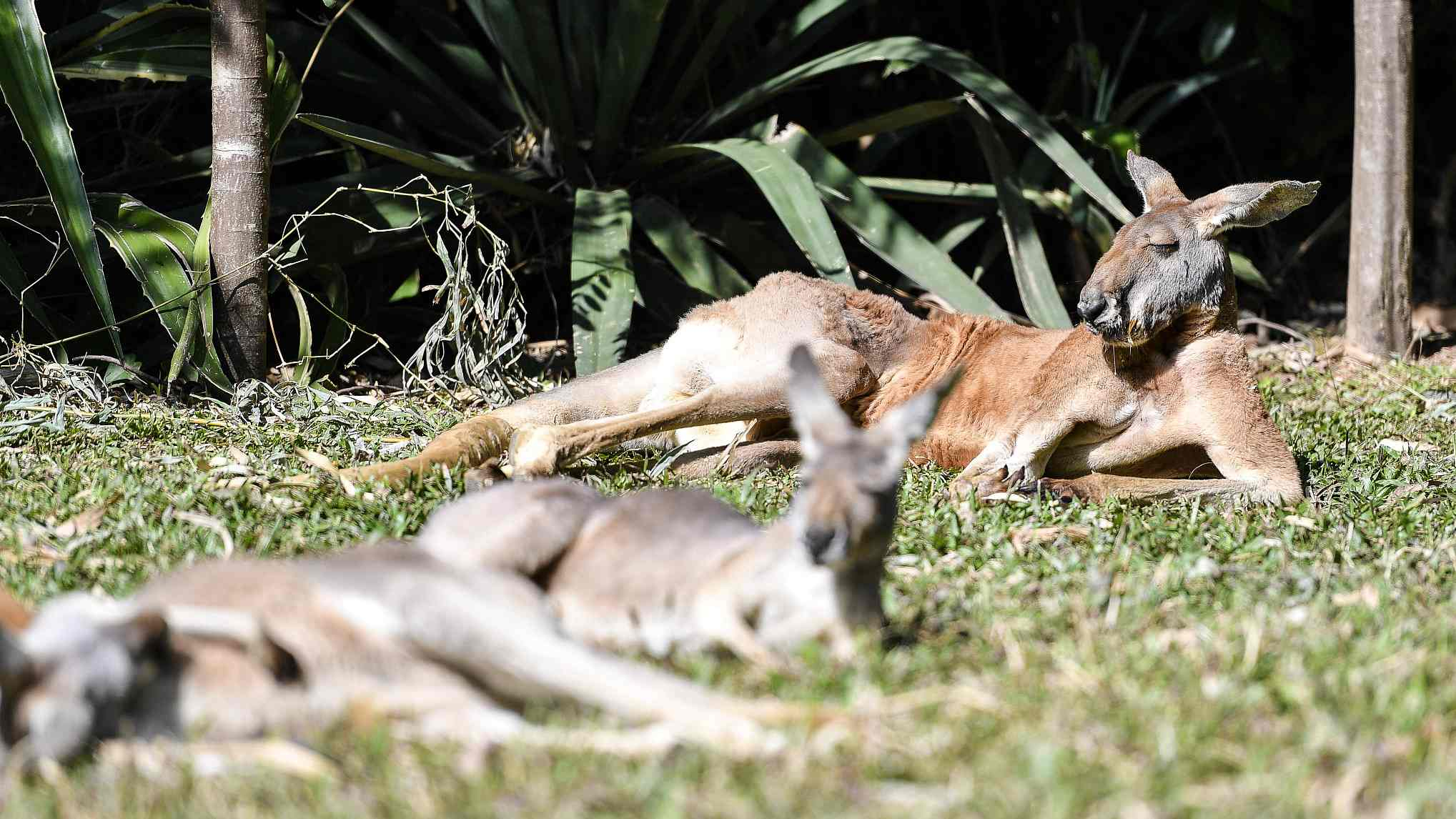Several kangaroos lying on the lawn, enjoying sunbath in Guangzhou, China. /VCG Photo