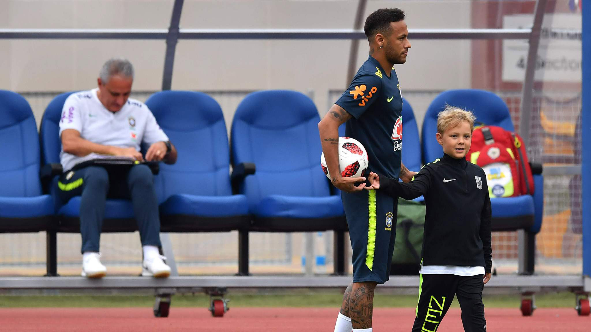 His luminaries Leo Messi and Cristiano Ronaldo may have already been knocked out of the World Cup, but Neymar doesn't seem to be taking it too seriously, as today he spent part of the training session playing with his son, Davi Lucca. Brazil's players and fans alike are pinning their hope on Neymar for a good game against Belgium on Saturday.