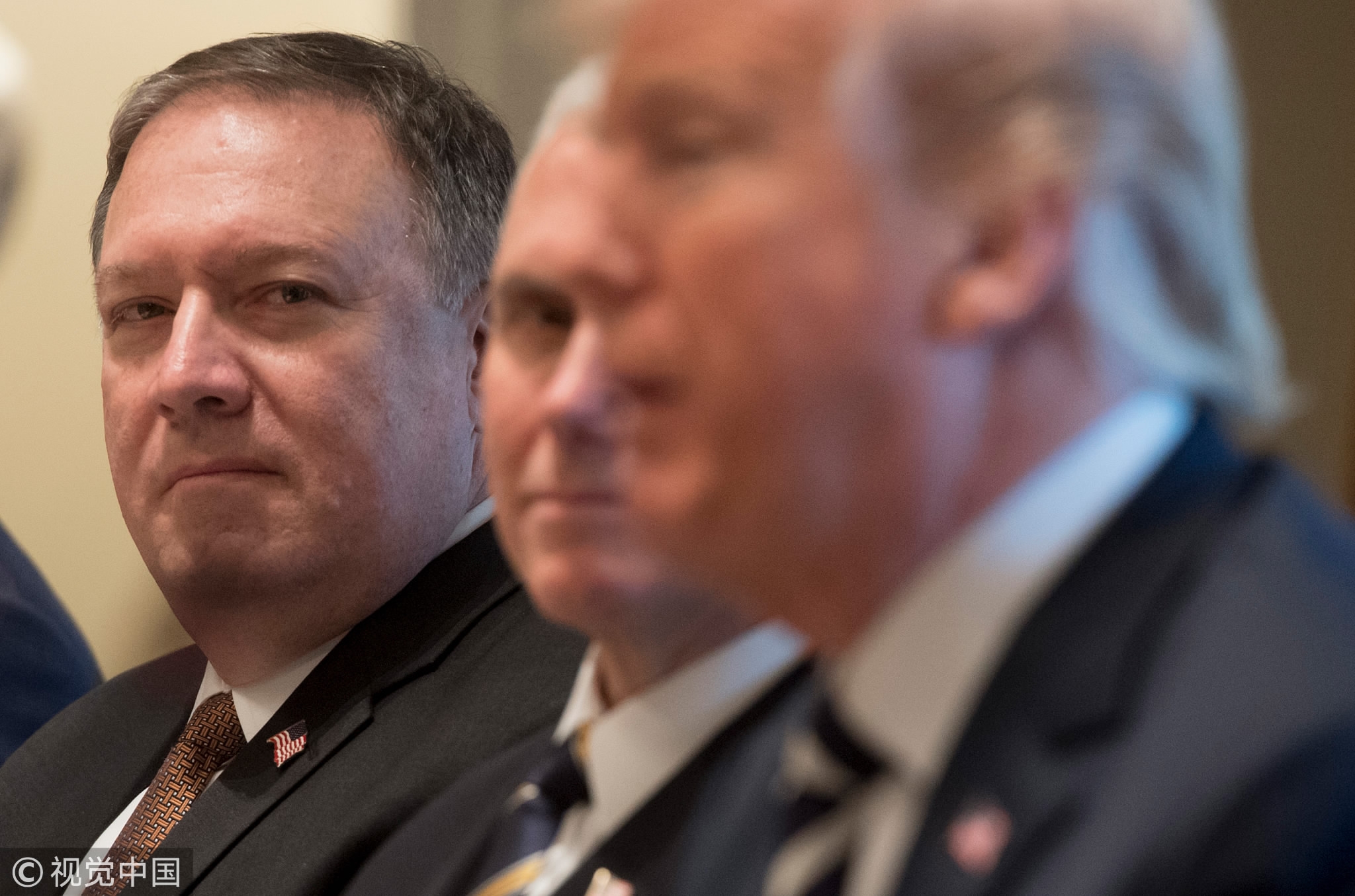 Former CIA director and secretary of state nominee Mike Pompeo (L) attends a lunch meeting with US President Donald Trump (R) and Saudi Arabia's Crown Prince Mohammed bin Salman, and members of his delegation, in the Cabinet Room of the White House in Washington, DC, March 20, 2018. /VCG Photo