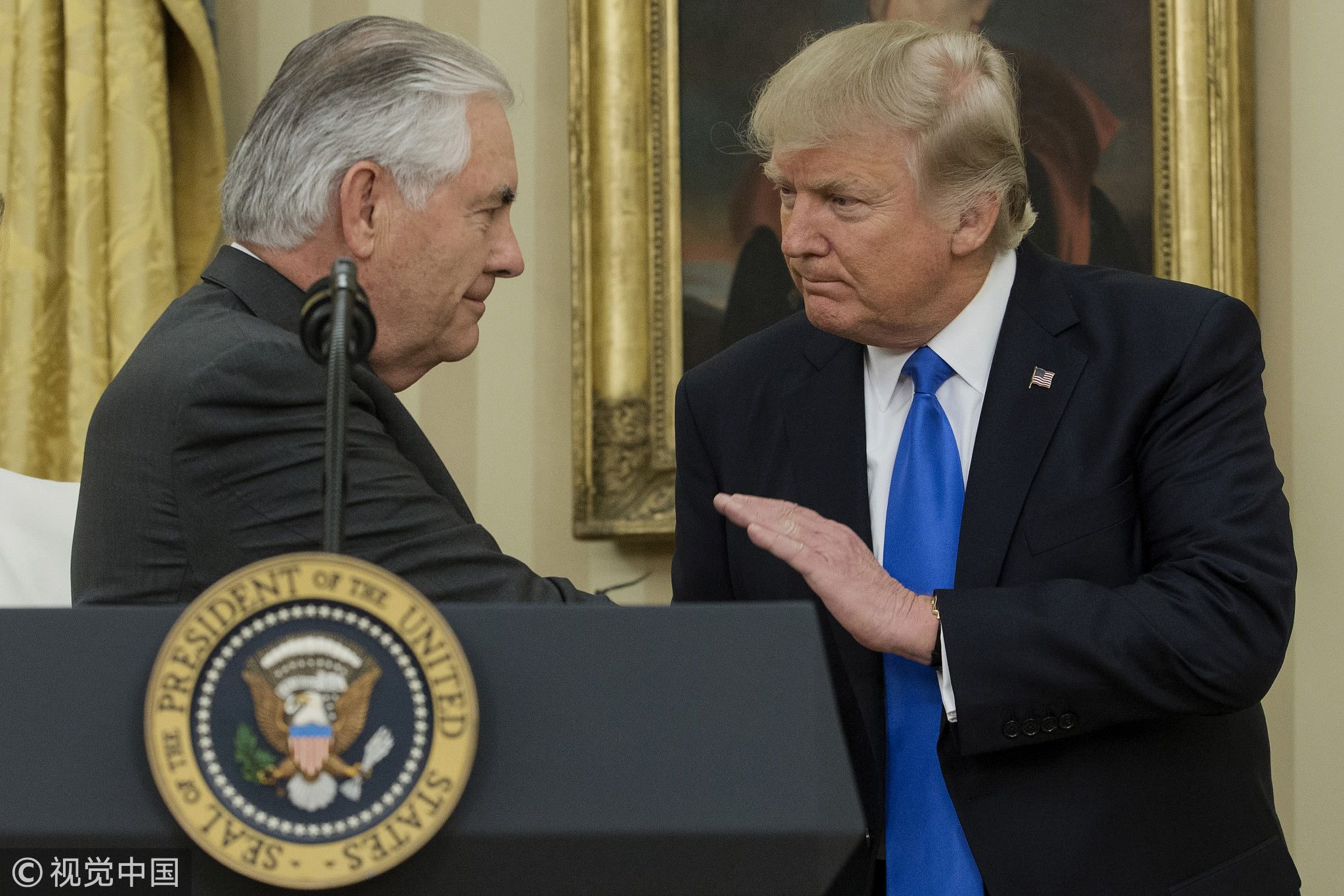 Rex Tillerson, former US secretary of state, left, shakes hands with US President Donald Trump during a swearing-in ceremony in the Oval Office of the White House in Washington, DC, US, February 1, 2017. /VCG Photo