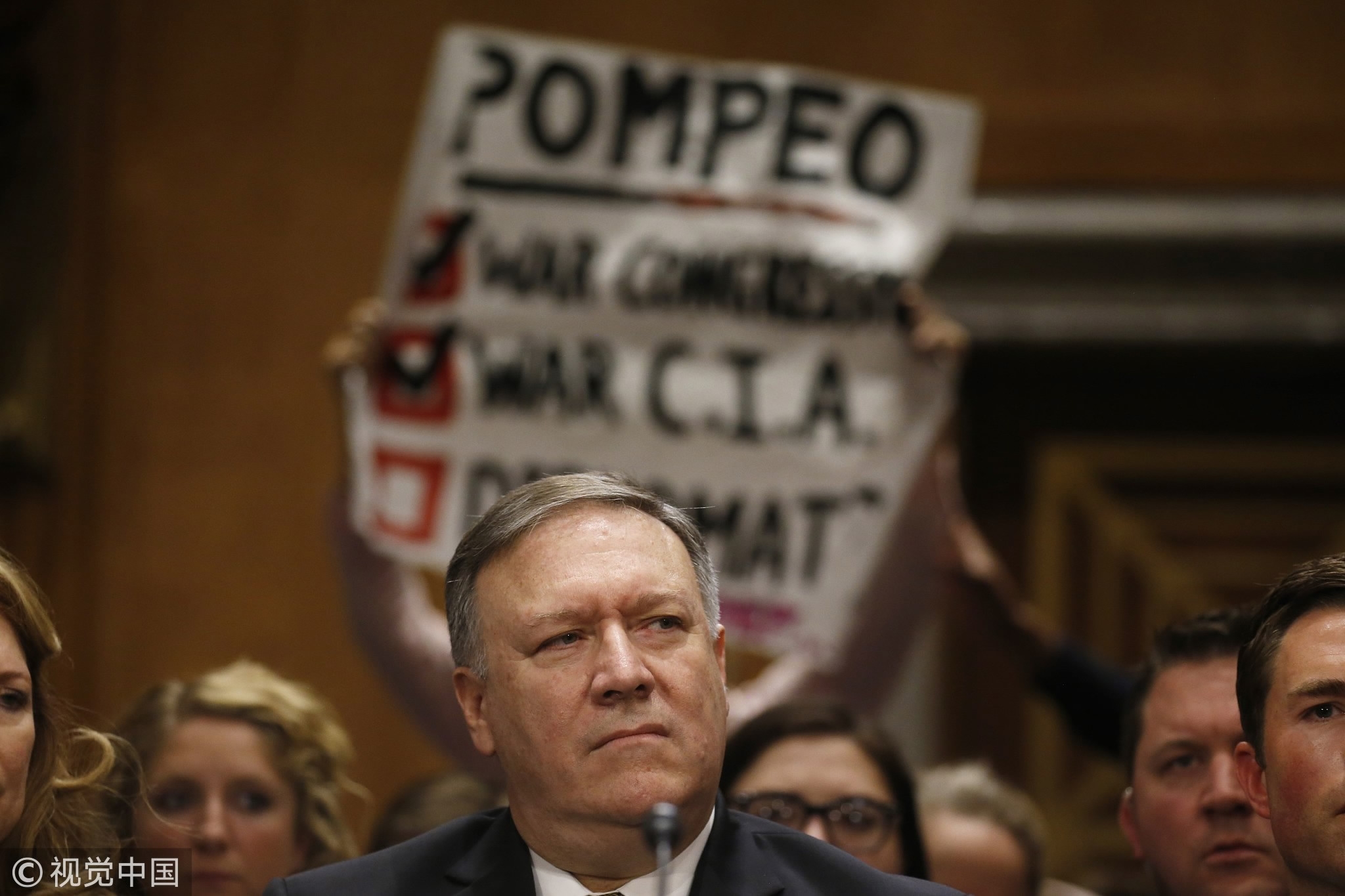 Protesters voice their opposition as CIA Director Mike Pompeo testifies before a Senate Foreign Relations Committee confirmation hearing on Pompeo’s nomination to be secretary of state on Capitol Hill in Washington, DC, US, April 12, 2018. /VCG Photo