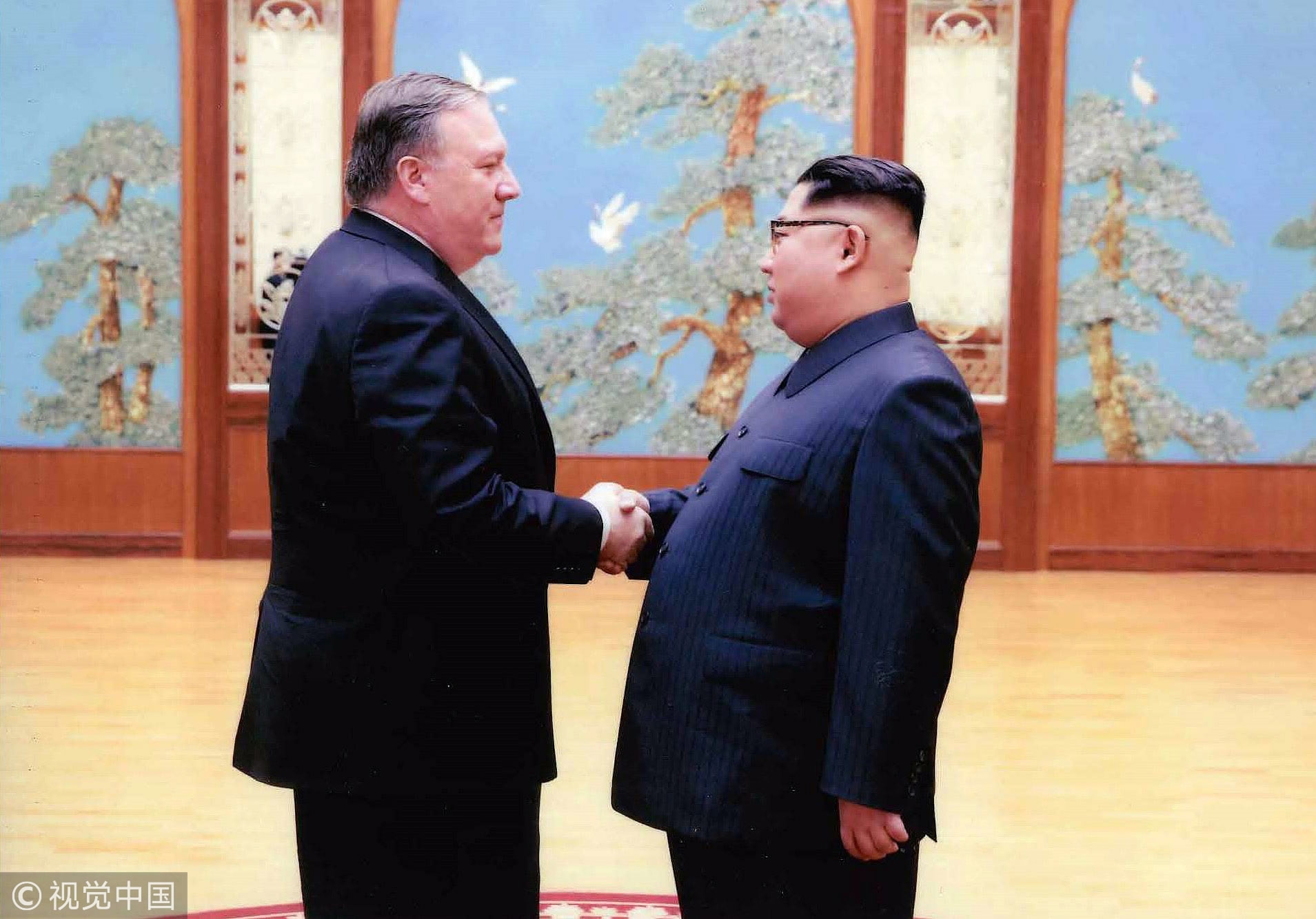 CIA director Mike Pompeo (L) shakes hands with DPRK leader Kim Jong Un in this undated image in Pyongyang, DPRK. /VCG Photo