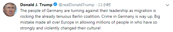 Trump tweeted that "the people of Germany are turning against their leadership" and added "Big mistake made all over Europe in allowing millions of people in who have so strongly and violently changed their culture!"