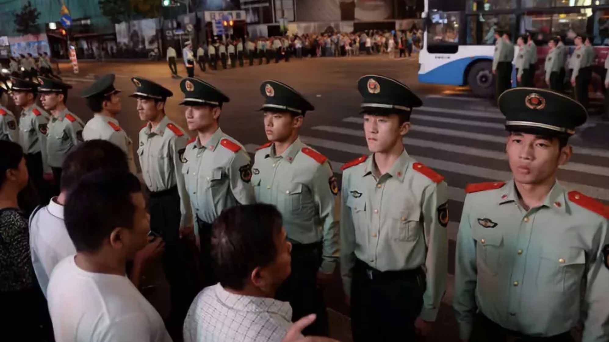 Due to the massive crowds in Shanghai during China’s National Day, police officers form a 60-man wall to control traffic in a busy intersection.