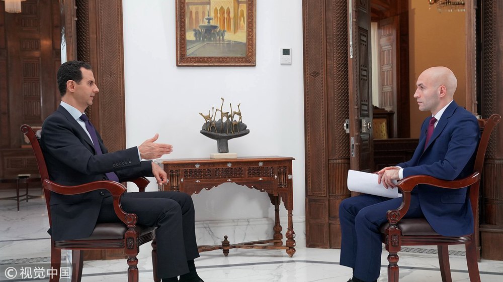 Syrian President Bashar al-Assad (L) gives an interview to a journalist from Russia Today in the capital Damascus, May 31, 2018. /VCG Photo