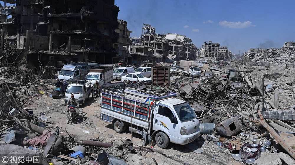 Cars on the territory of the former Yarmouk Palestinian refugee camp in Syria /VCG Photo