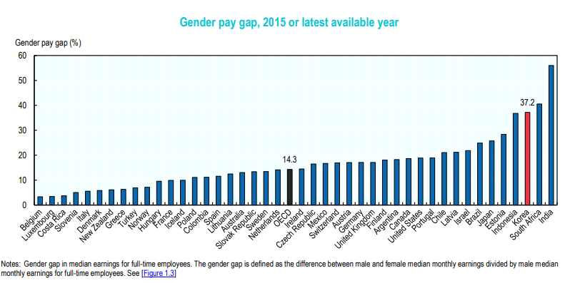 At 63 percent, South Korea has the largest gender wage gap among all 35 member countries of the Organization for Economic Cooperation and Development (OECD). This means for every dollar a man in South Korea makes, a woman earns just 63 cents.