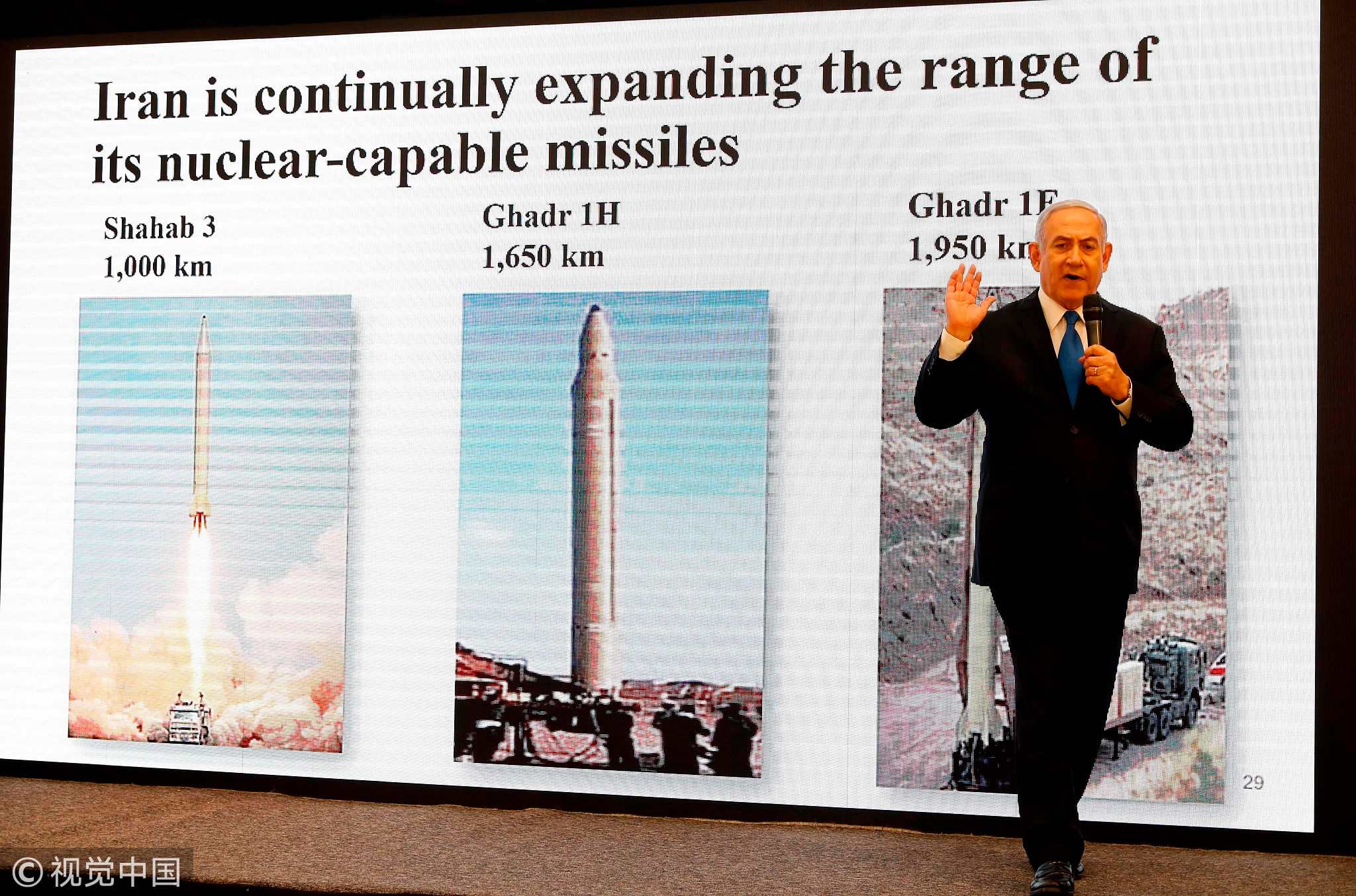 Israeli Prime Minister Benjamin Netanyahu delivers a speech on Iran's nuclear program at the defense ministry in Tel Aviv on April 30, 2018./VCG Photo.