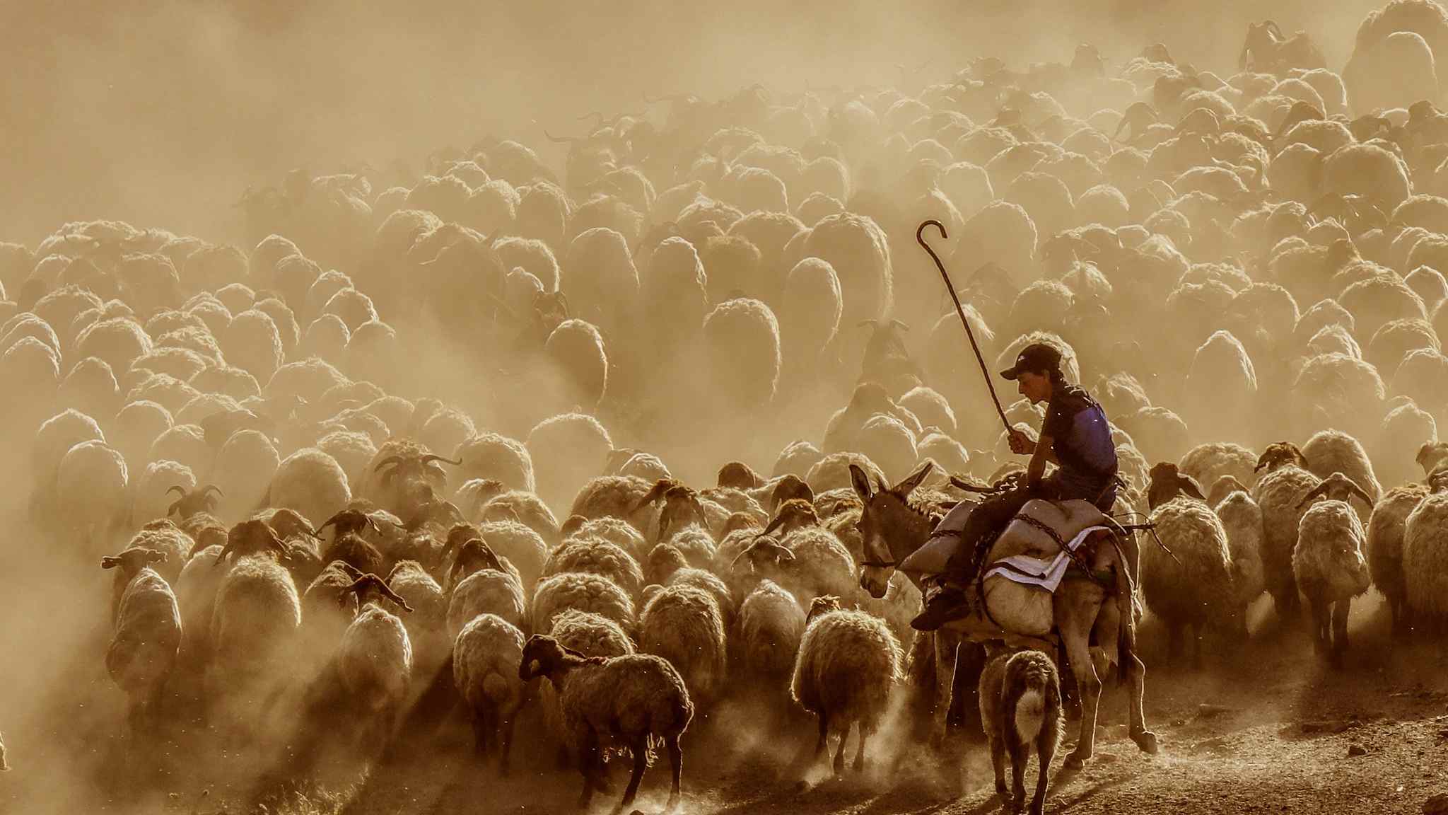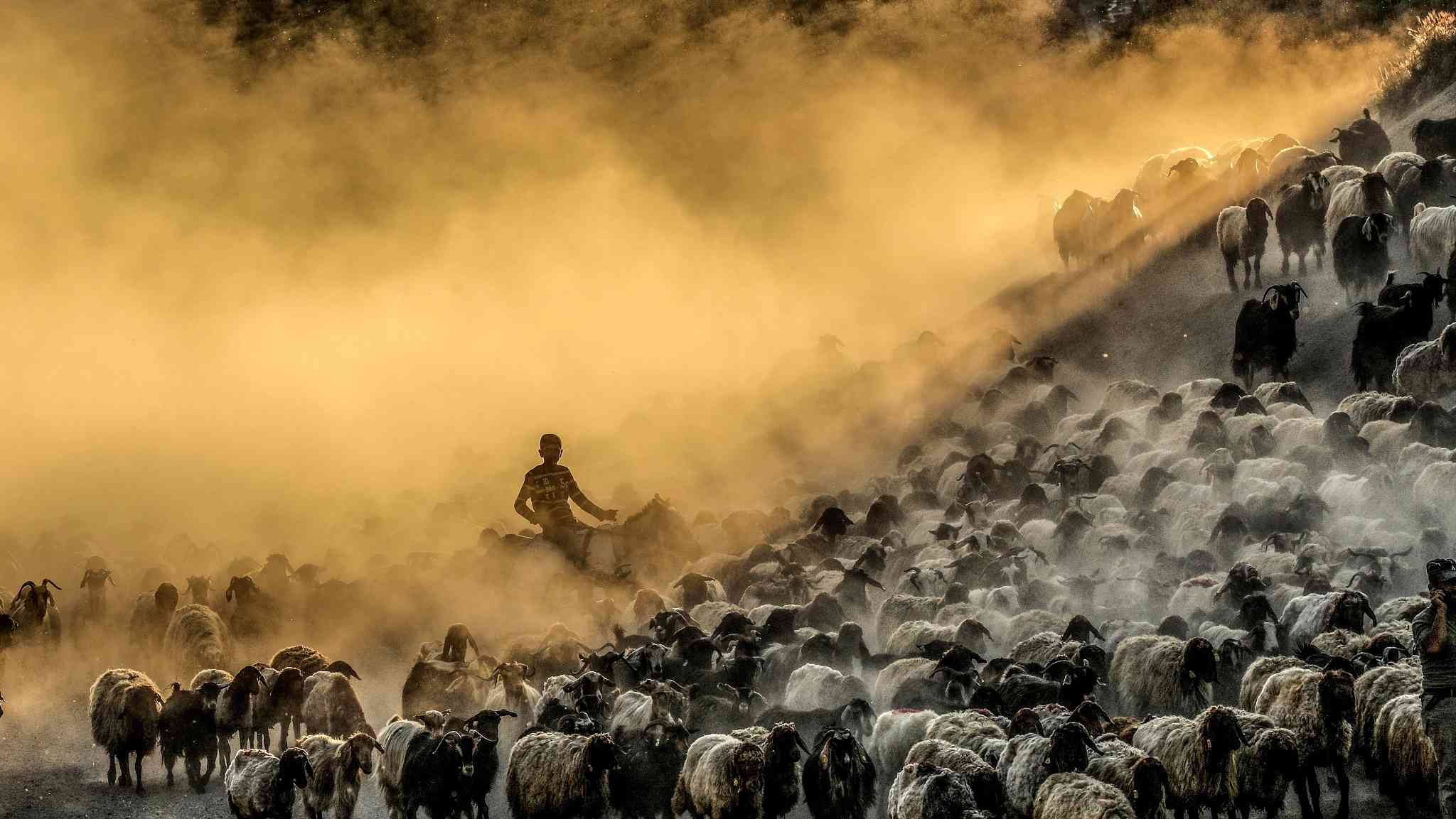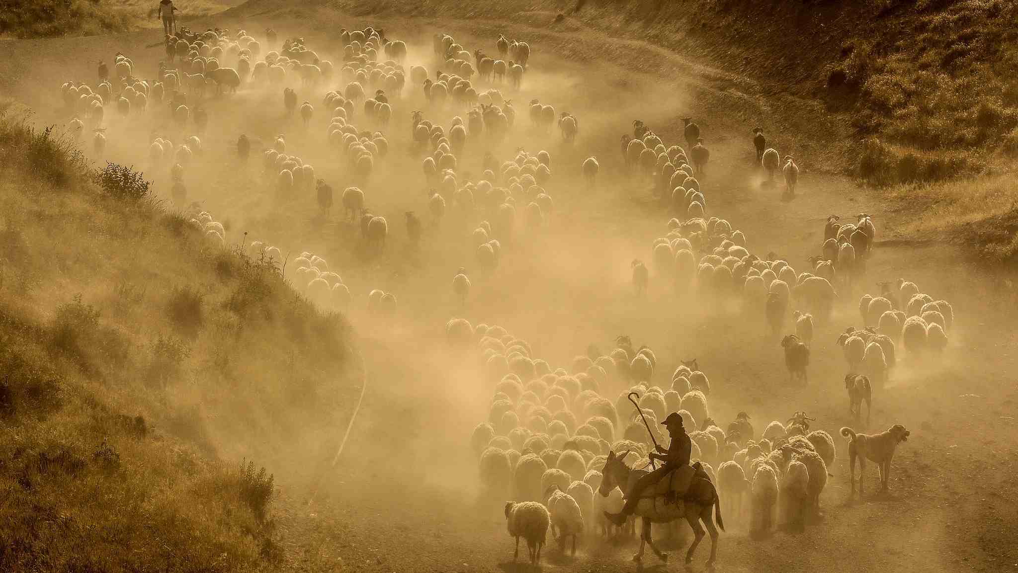 A flock of sheep was captured walking in a cloud of dust through the tablelands of Mount Nemrut in Bitlis, Turkey. /VCG Photo