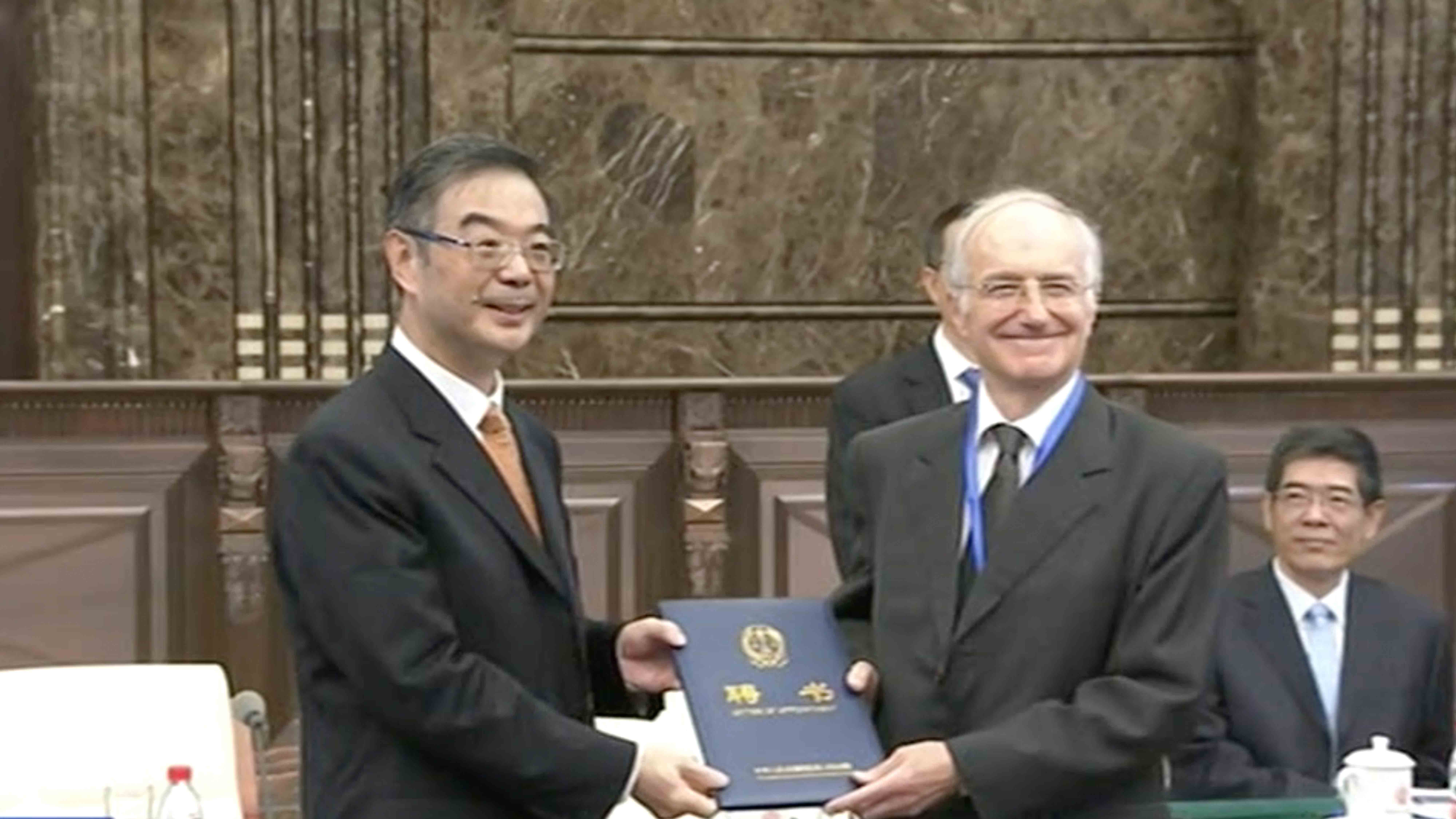 Chief Justice Zhou Qiang (left) and Sir William Blair at the ceremony establishing the committee. /CGTN Photo