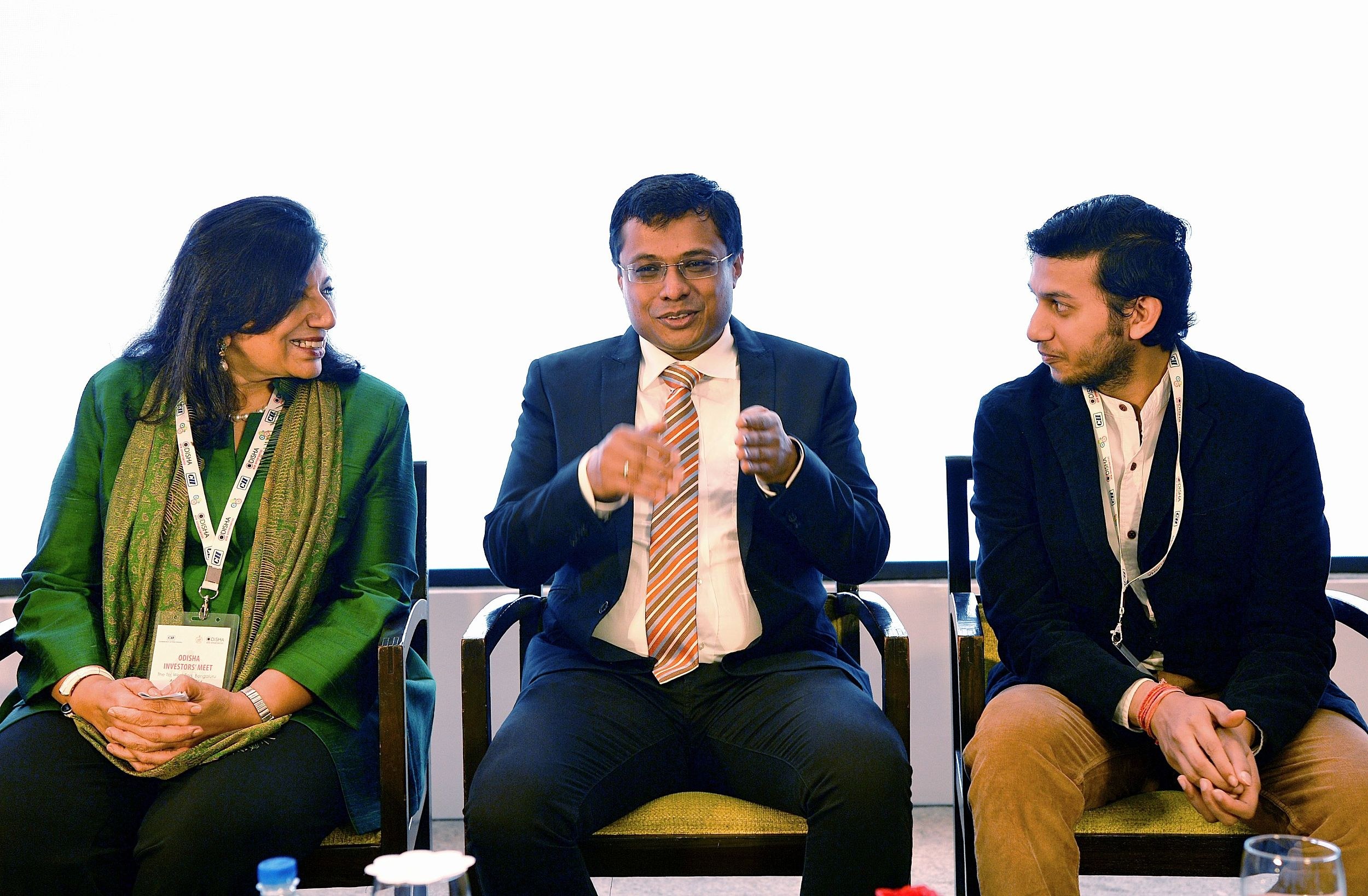 Co-founder of FlipKart, Sachin Bansal, flanked by Chairman and Managing Director of Bicon India Limited, Kiran Mazumdar Shaw (L) and CEO of OYO Rooms, Ritesh Agarwal at the Odisha Investors Meet in Bangalore, August 2016. /VCG Photo
