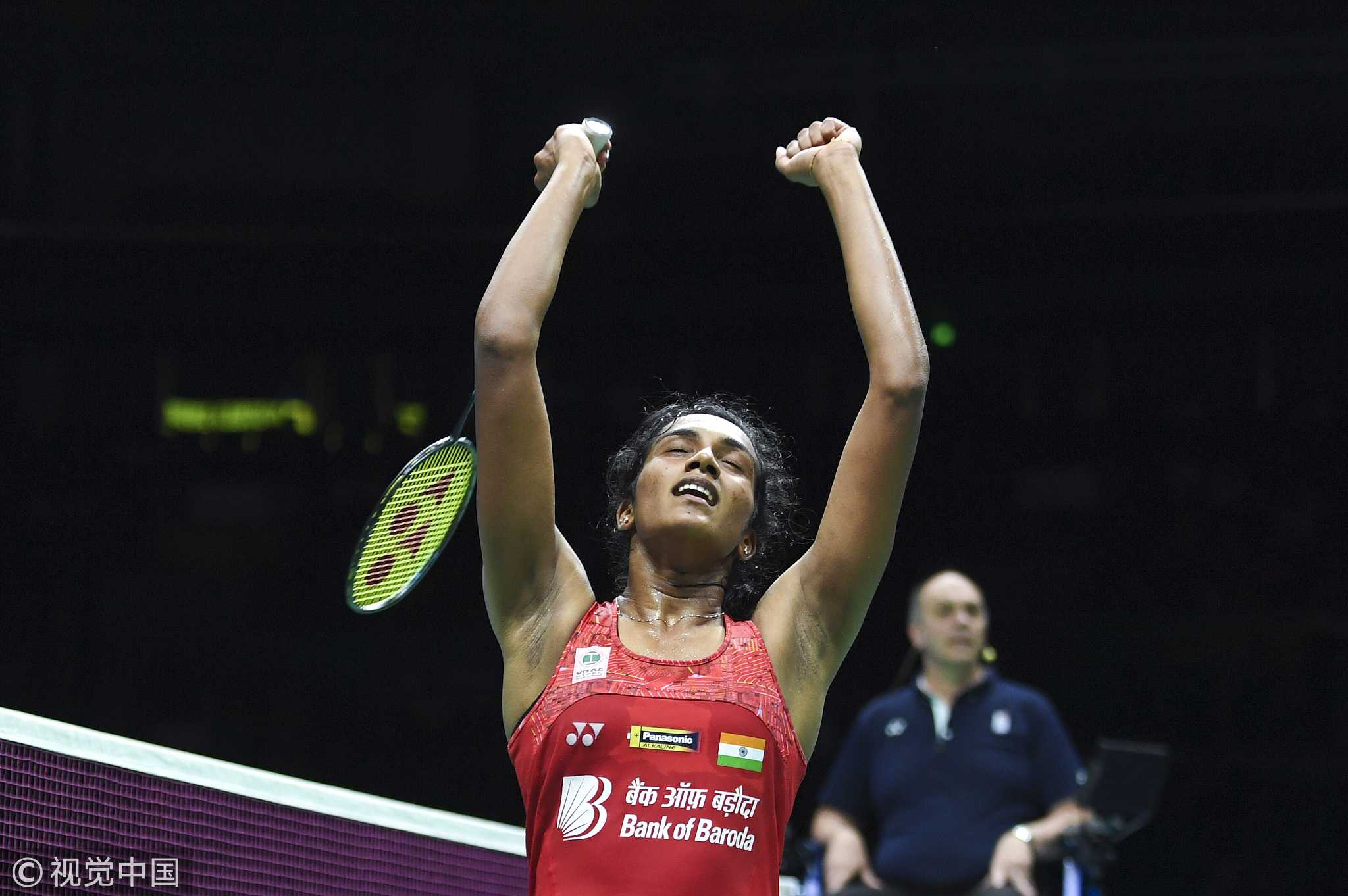 Sindhu of India celebrates racing into women‘s singles final. /VCG Photo