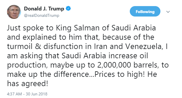 Trump tweeted: “Just spoke to King Salman of Saudi Arabia and explained to him that, because of the turmoil & disfunction in Iran and Venezuela, I am asking that Saudi Arabia increase oil production, maybe up to 2,000,000 barrels, to make up the difference ... Prices to high! He has agreed!”