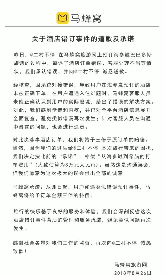 In the statement, the company made an apology for the wrong booking and the solutions offered by its customer service. Mafengwo promised that it will compensate three times the booking fees, all fees for his accommodation in Russia, and pay the taxi fares from Russia to Greece, around 80,000 yuan.