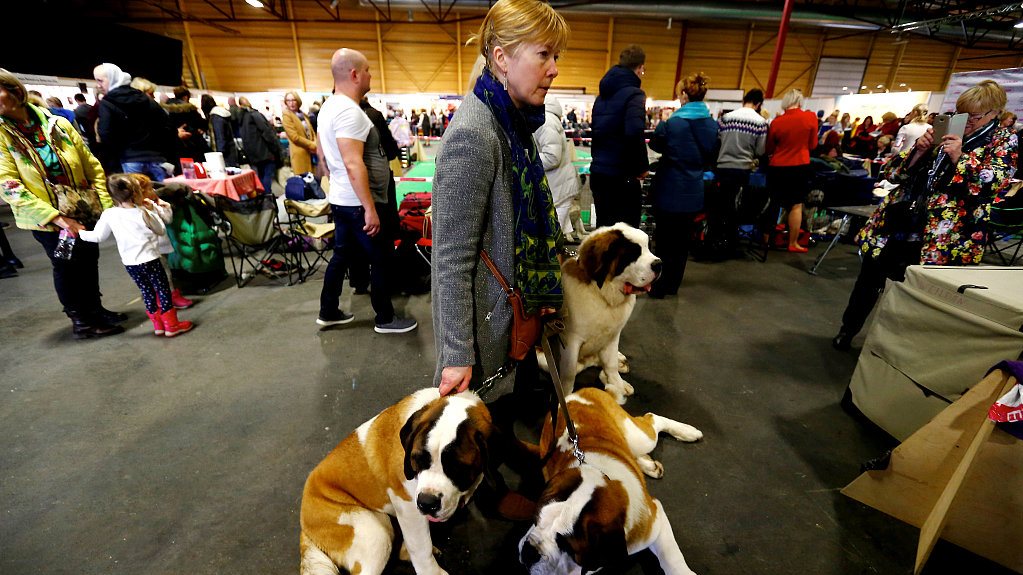 A woman with Saint Bernard dogs waits for a show during the international PetExpo. /VCG Photo