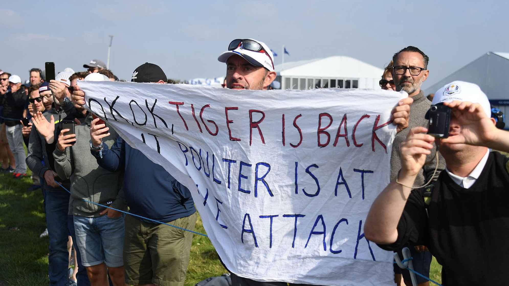 A supporter holds a banner for Tiger Woods during his foursomes match on the first day of the 42nd Ryder Cup at Le Golf National Course, September 28, 2018. /VCG Photo