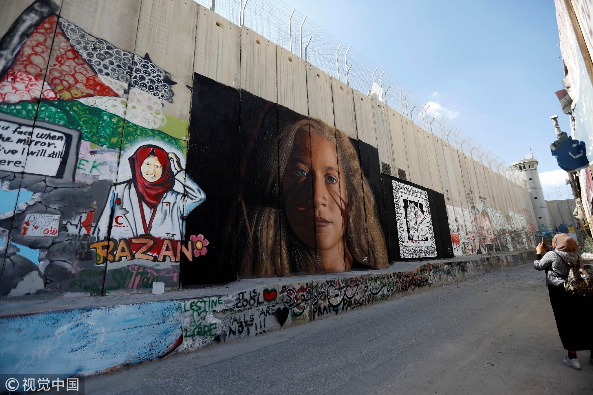 A woman takes a photo of a mural of jailed Palestinian teen Ahed Tamimi on the separation barrier in Bethlehem, West Bank, July 29, 2018. /VCG Photo