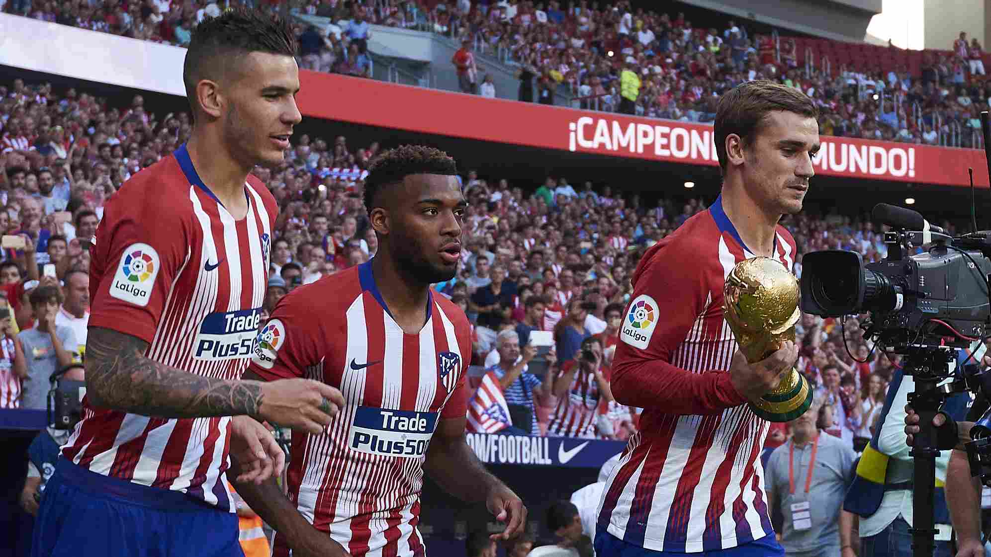 Antoine Griezmann (R), Thomas Lemar (C) and Lucas Hernandez of Atletico de Madrid pose with FIFA World Cup 2018 trophy prior to the La Liga match between Club Atletico de Madrid and Rayo Vallecano de Madrid at Wanda Metropolitano on August 25, 2018. /VCG Photo