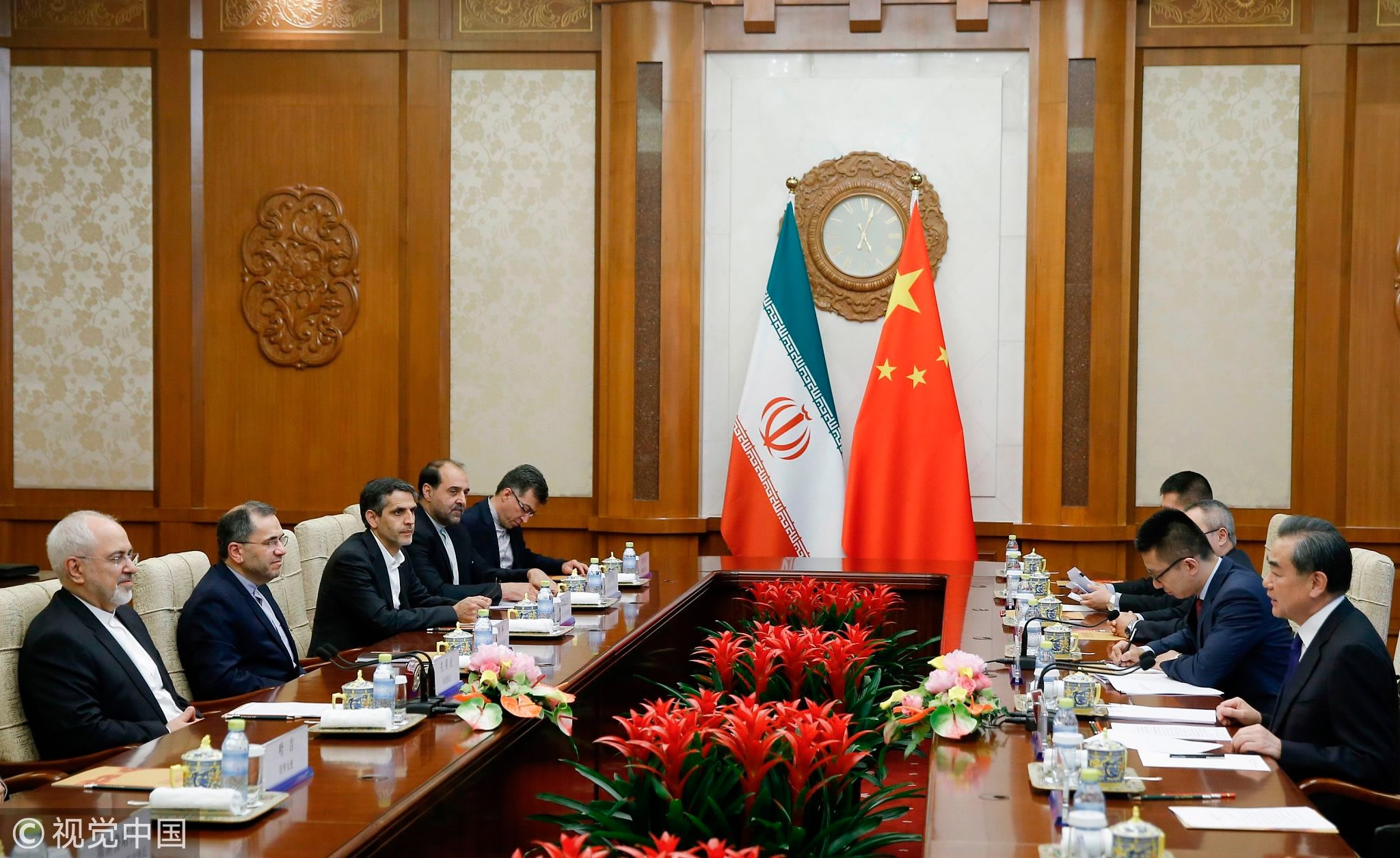 Chinese State Councillor and Foreign Minister Wang Yi (R) holds talks with Iranian Foreign Minister Mohammad Javad Zarif (L) at the Diaoyutai state guesthouse in Beijing on May 13, 2018. /VCG Photo