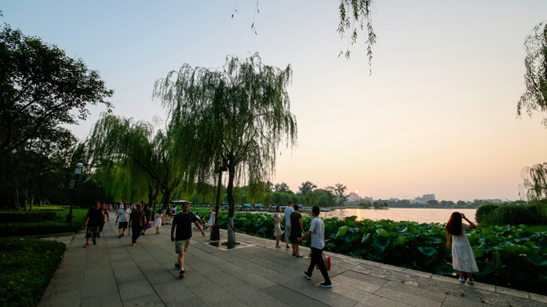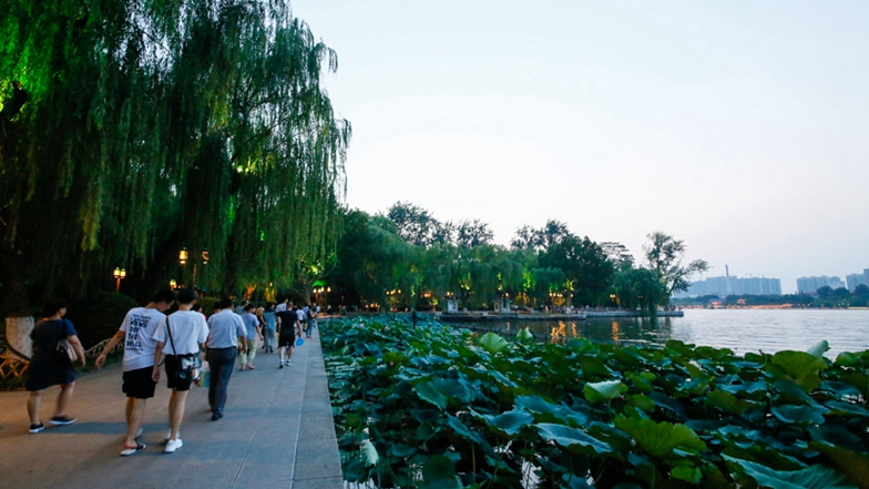 People walk along the Daming Lake after dark in Jinan, Shandong Province. Lotus flowers are currently blooming in lake, attracting many tourists and shutterbugs to the mesmerizing spot. /CD Photo