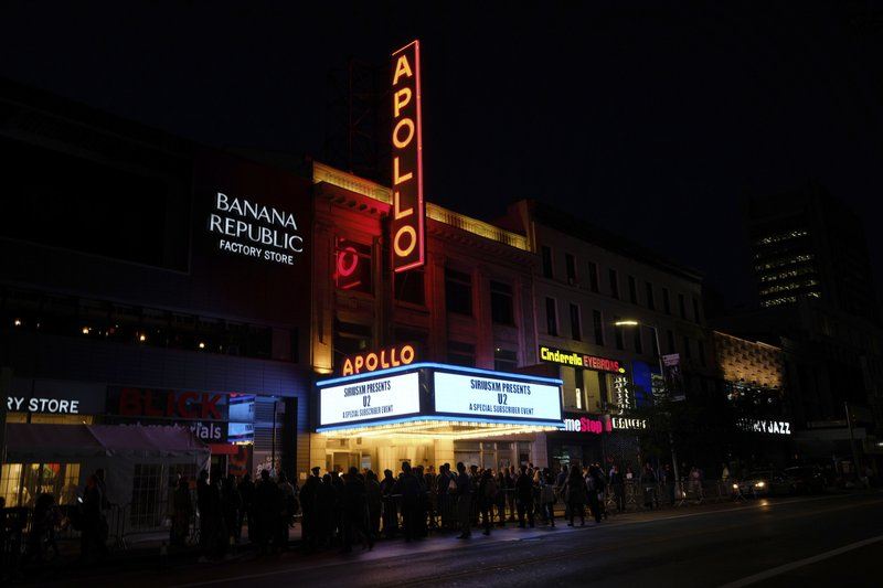 Apollo Theater marquee promoting the U2 SiriusXM concert on Monday, June 11, 2018, in New York City, New York, US. /AP Photo