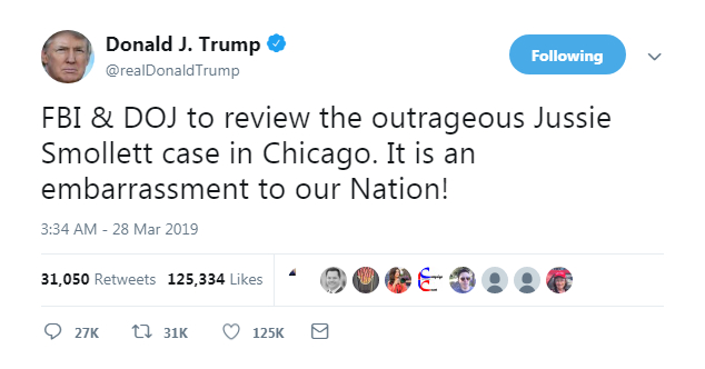 "FBI & DOJ to review the outrageous Jussie Smollett case in Chicago. It is an embarrassment to our Nation!" Trump tweeted in response to the controversy over the case.