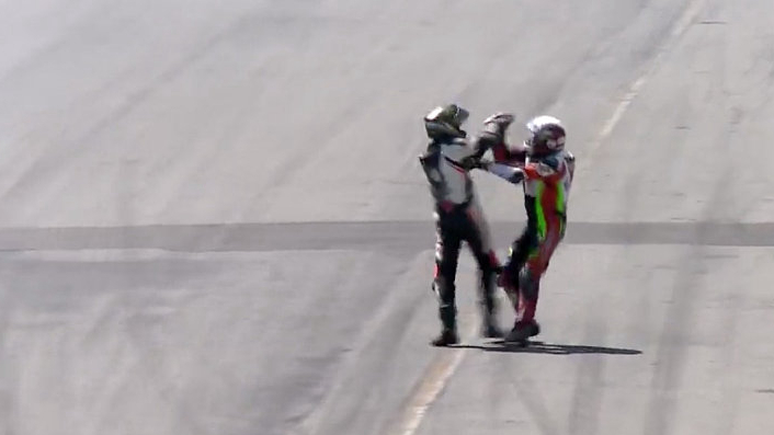The race in the Central American country's Alajuela city on February 17 saw their bikes got entangled during the race and subsequently, both riders got into utterly funny fisticuffs in the middle of the track.