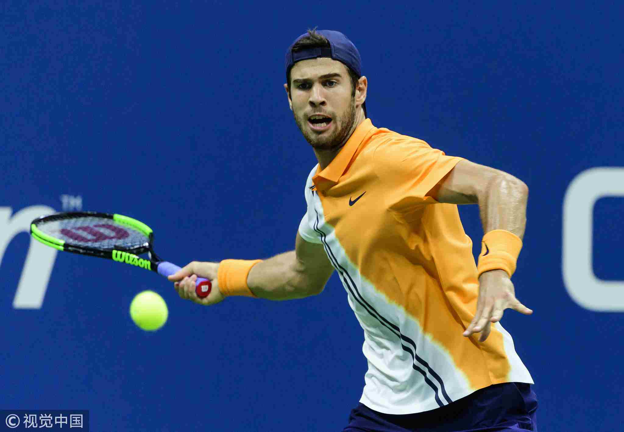 Karan Khachanov of Russia in action against Rafael Nadal of Spain in the third round of the US Open at the USTA Billie Jean King National Tennis Center on August 31, 2018 in New York City, United States /VCG Photo