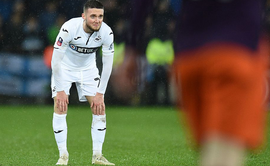 Swansea City's Matt Grimes reacts after losing the FA Cup quarterfinal against Manchester City on March 16, 2019. /VCG Photo