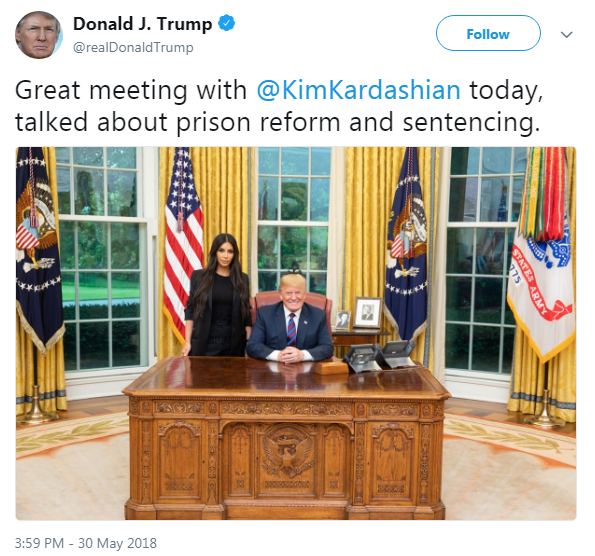 "Great meeting with @KimKardashian today, talked about prison reform and sentencing," Trump said in a tweet, accompanied by a photograph of the pair in the Oval Office, with Trump flashing a broad grin.