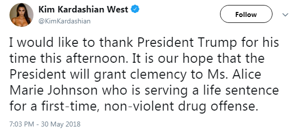 The 37-year-old is advocating for a pardon for a low-level drug offender named Alice Marie Johnson. Johnson, 63, is currently serving a life sentence in prison and was not eligible for parole. She was convicted in 1996 on eight criminal counts related to a Memphis-based cocaine trafficking operation that involved more than a dozen people. Johnson was sentenced to life in prison the next year.