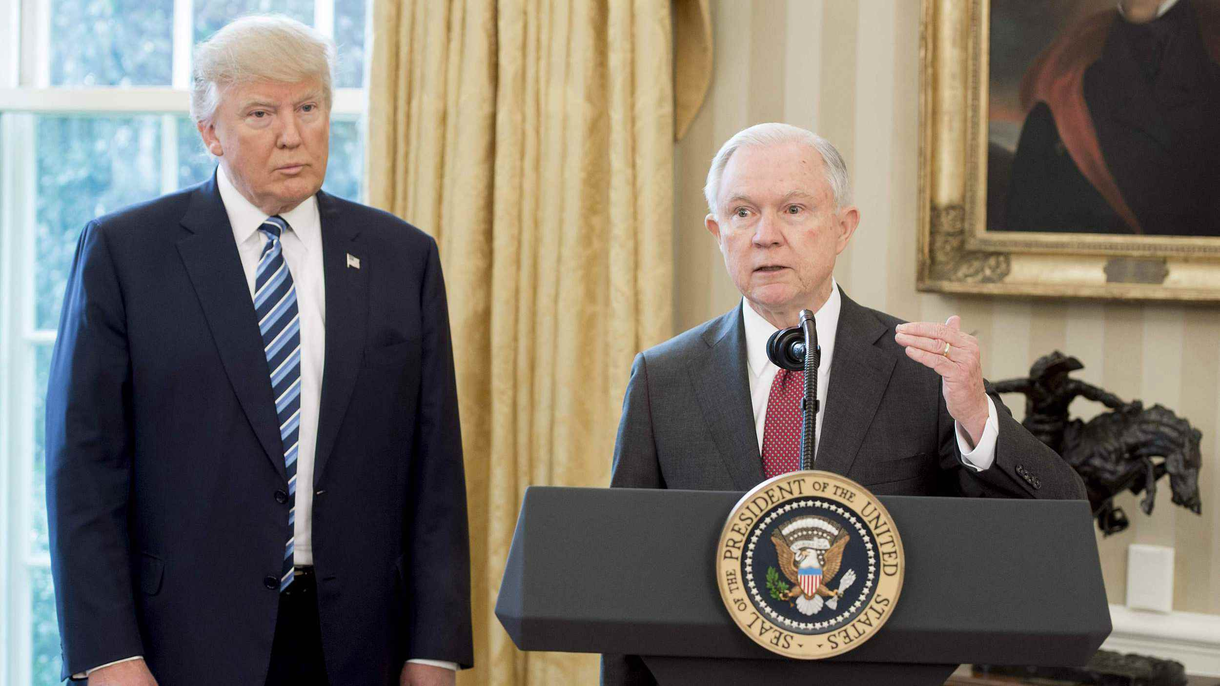 US President Donald Trump stands alongside US Attorney General Jeff Sessions after Sessions was sworn in, in the Oval Office of the White House, February 9, 2017. /VCG Photo