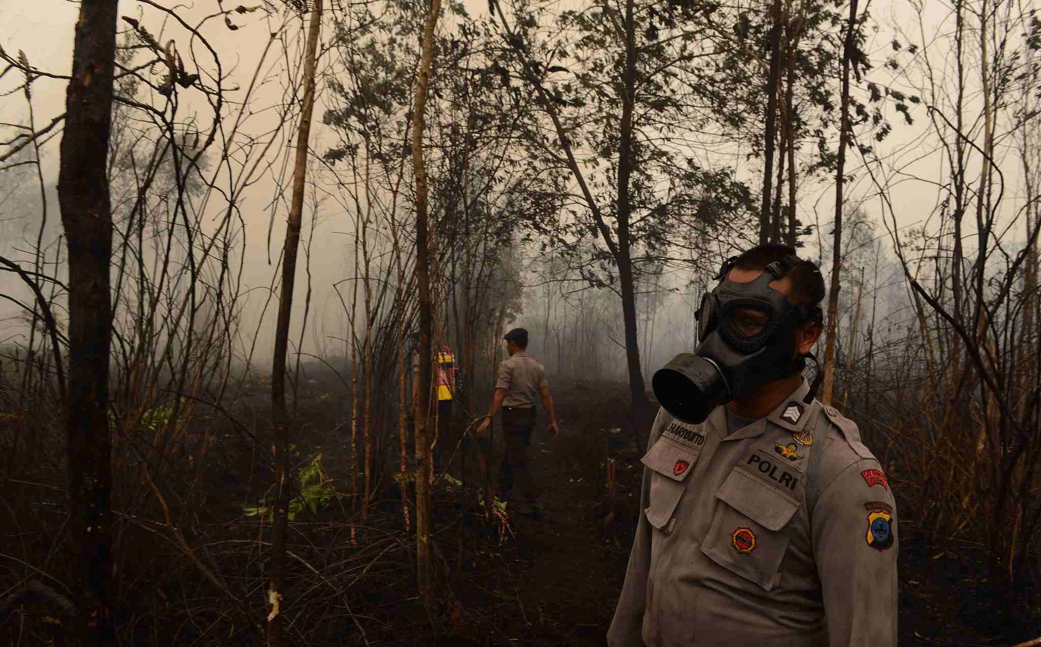 September 24, 2015: Indonesian police and firefighters extinguish a fire on burning peatland in the district of Kapuas on Borneo Island during Indonesian President Joko Widodo's inspection of a firefighting operation to control agricultural and forest fires. /VCG Photo