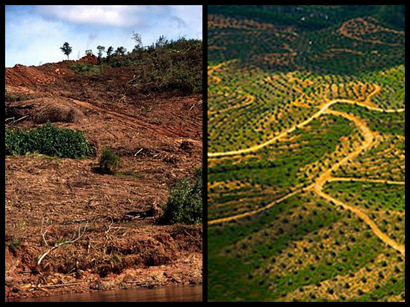 Damage caused by industrial machinery (L) and aerial view of palm oil plantation on deforested land (R), Sabah, Borneo /Photo via World Wildlife Fund website