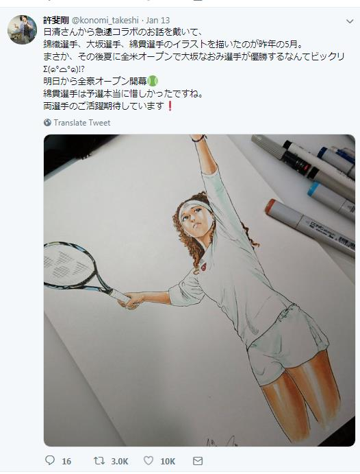 The sketch of Naomi Osaka that can be found on cartoonist Takeshi Konomi's Twitter, Thursday. /VCG Photo