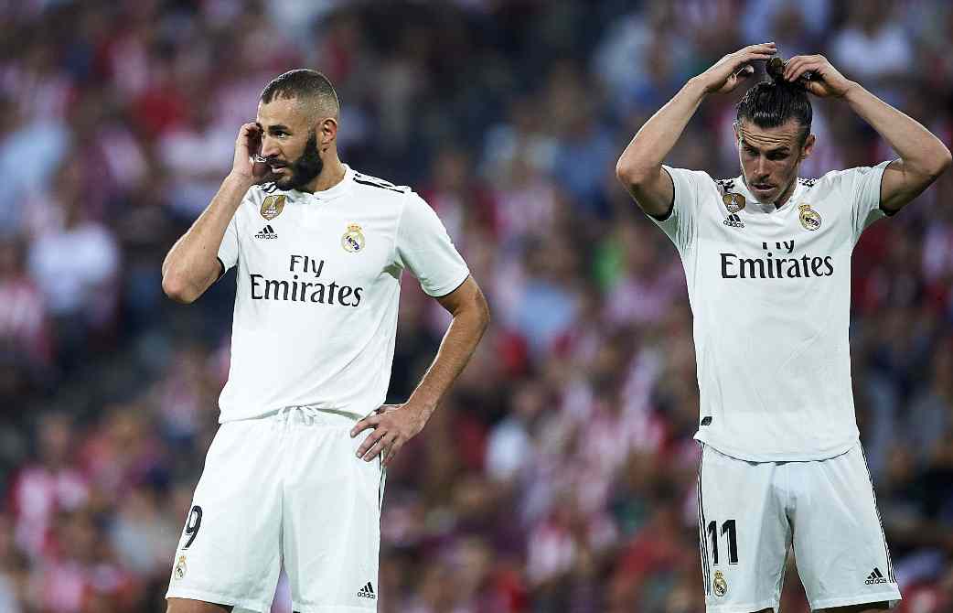 Karim Benzema (L) and Gareth Bale show their frustration after Real Madrid conceded a goal against Athletic Bilbaoon on September 15. /VCG Photo