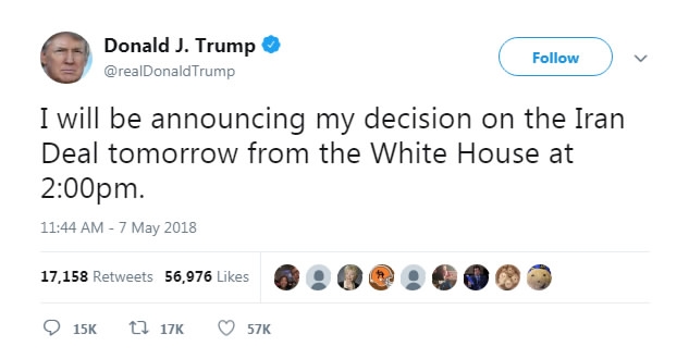 "I will be announcing my decision on the Iran Deal tomorrow from the White House at 2:00 p.m.," Trump said in a Twitter post on Monday.