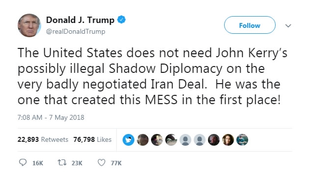 Trump said on Twitter: "The United States does not need John Kerry's possibly illegal Shadow Diplomacy on the very badly negotiated Iran Deal. He was the one that created this MESS in the first place!"