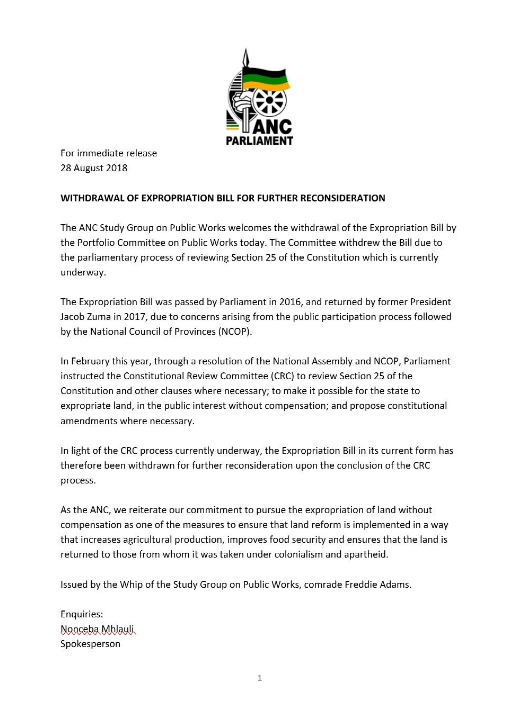 The ANP Parliament's official Twitter account posts a statement confirming the Expropriation Bill has been withdrawn for further consideration.