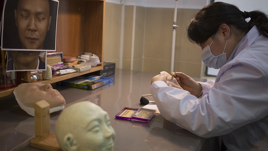 Researchers started by logging the photos of the deceased into a computer to generate 3D face models with white resinous material. And then a cosmetic surgeon applies makeup on the faces to make them look more natural, with skin color and facial hair resembling real humans. /VCG Photo