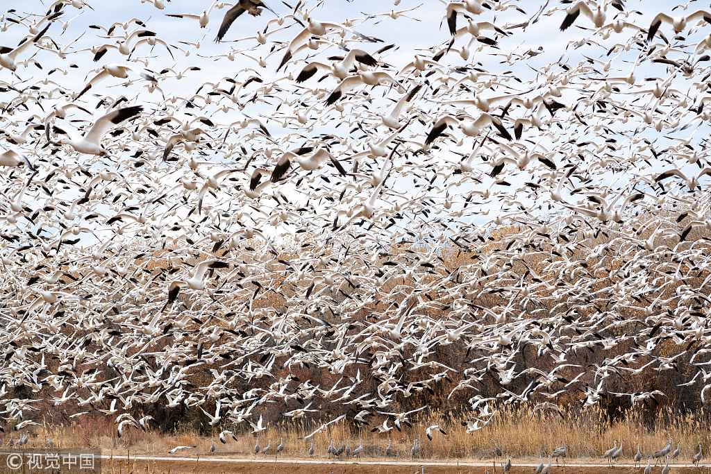 Surreal photo captures a flock of geese bursting into flight together