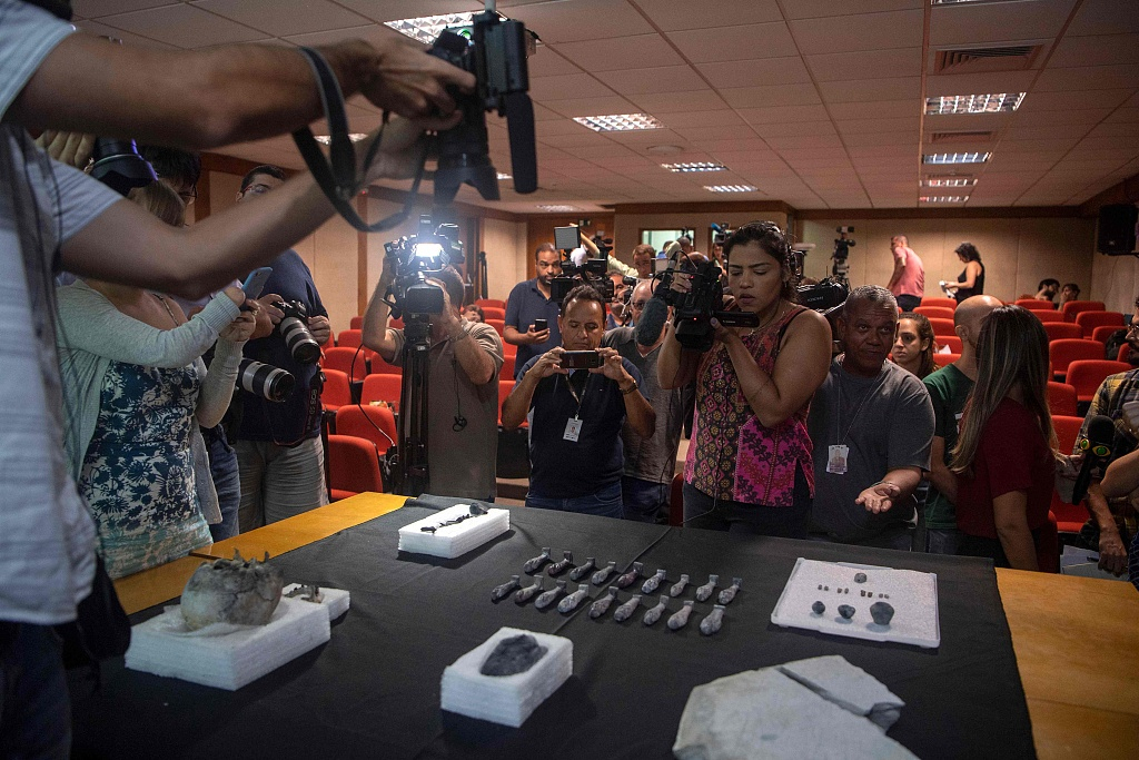 Several precious Egyptian artifacts were displaced at Brazil's national museum on Tuesday. These pieces were found among the debris of the museum, which was gutted by a devastating fire last September. /VCG Photo