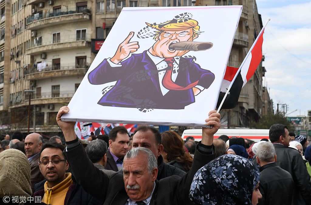 Syrians protest in the northern city of Aleppo against the U.S. decision to recognize Israel's sovereignty over Golan Heights, March 26, 2019. /VCG Photo