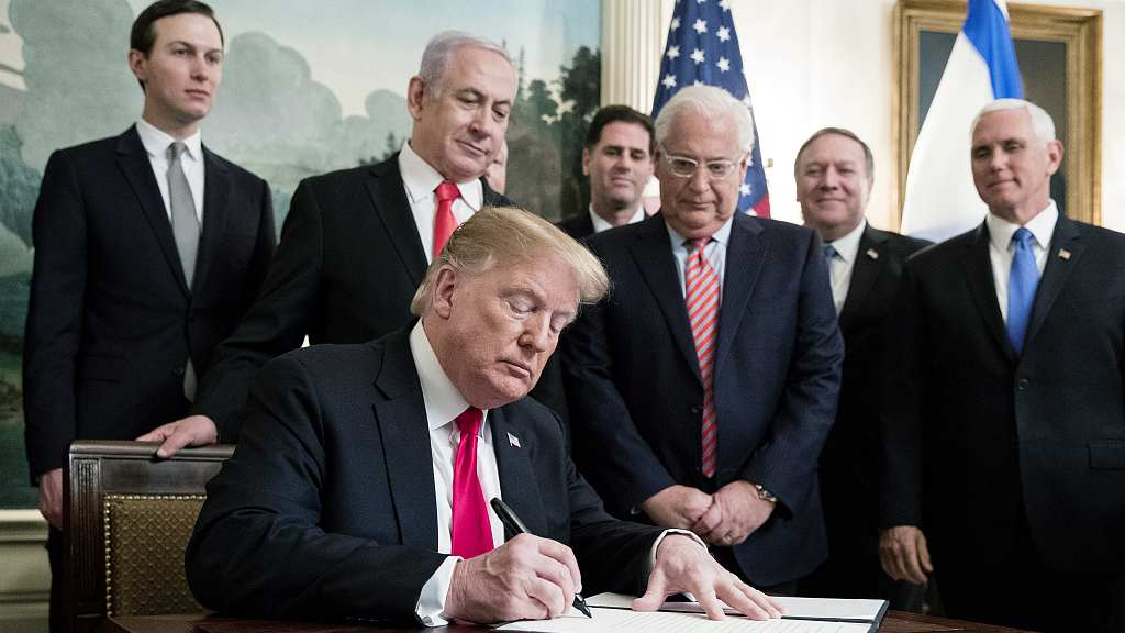 U.S. President Donald Trump signs a proclamation officially granting U.S. recognition of Golan as Israeli territory in Washington D.C., U.S., Mar. 25, 2019. /VCG Photo