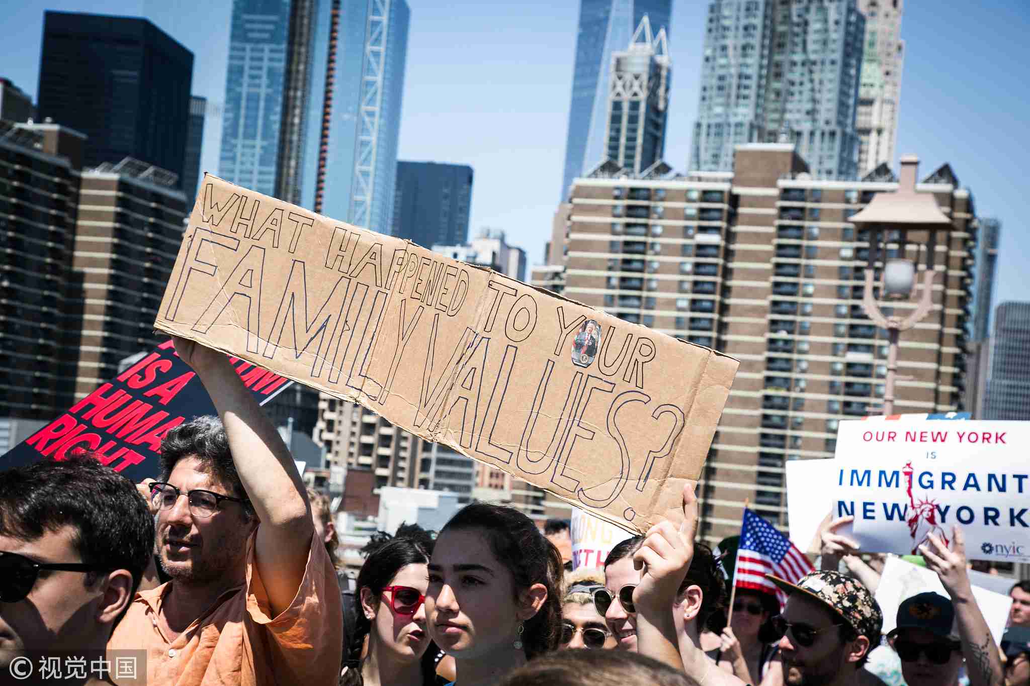 Thousands of Demonstrators hold placards and march to protest U.S President Donald J. Trump and his immigration policy concerning Muslims and Immigrants from Latin America in New York, US, on 30 June 2018. /VCG Photo