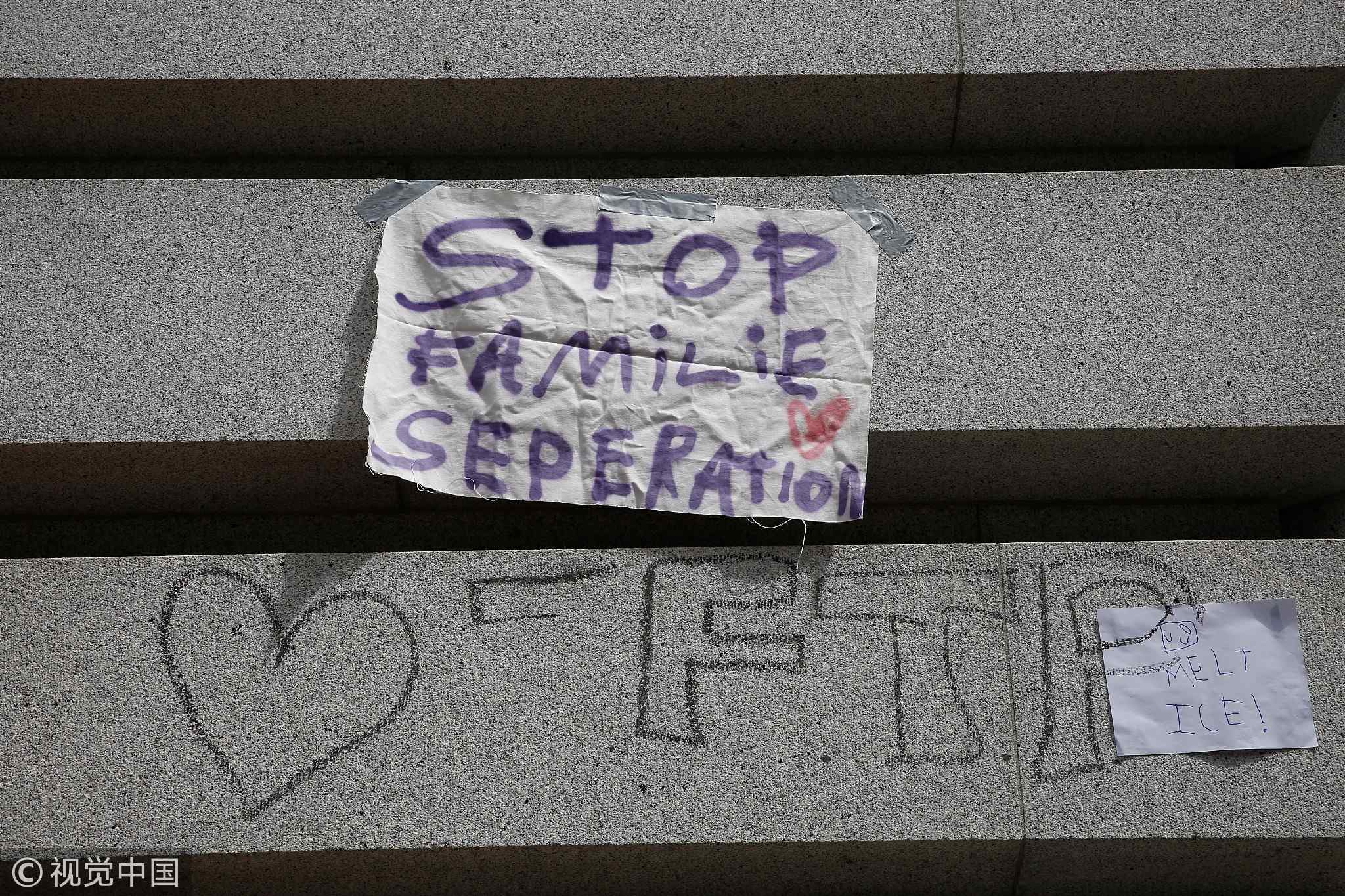 Banner reads 'Stop Familie Separation' during a protest against US immigration policies outside of the San Francisco office of the Immigration and Customs Enforcement (ICE) on July 04, 2018 in San Francisco, California, United States. /VCG Photo