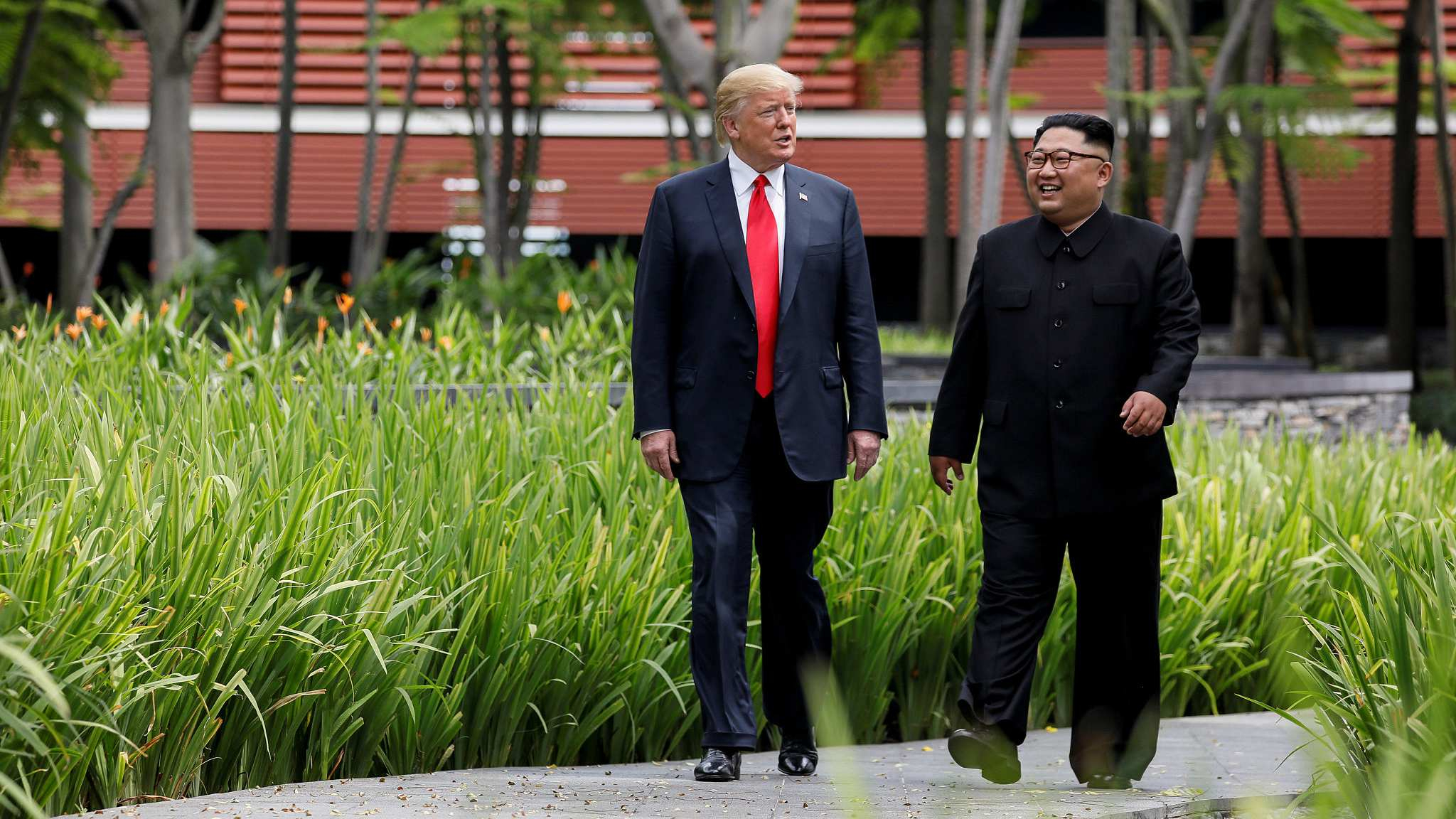 US President Donald Trump and DPRK leader Kim Jong Un walk together during their summit at the Capella Hotel on the resort island of Sentosa, Singapore, June 12, 2018. /VCG Photo
