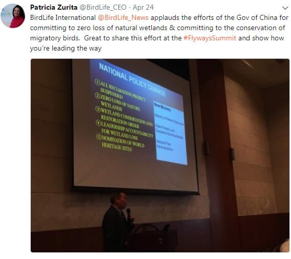 A senior delegate tweeted about China's action to protect wetlands, a crucial habitat of migratory birds. /Twitter Screenshot