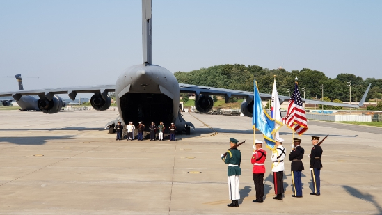 Before being repatriated to the US, a ceremony was held in an aircraft hangar at Osan Airbase, which is just south of Seoul. About 500 dignitaries including Commander of the US Forces in Korea Vincent K. Brooks attended the ceremony.