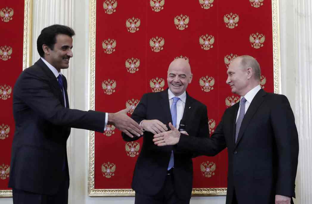 Emir of Qatar Tamim bin Hamad Al Thani shakes hand with FIFA President Gianni Infantino and Russia's President Vladimir Putin. /VCG Photo